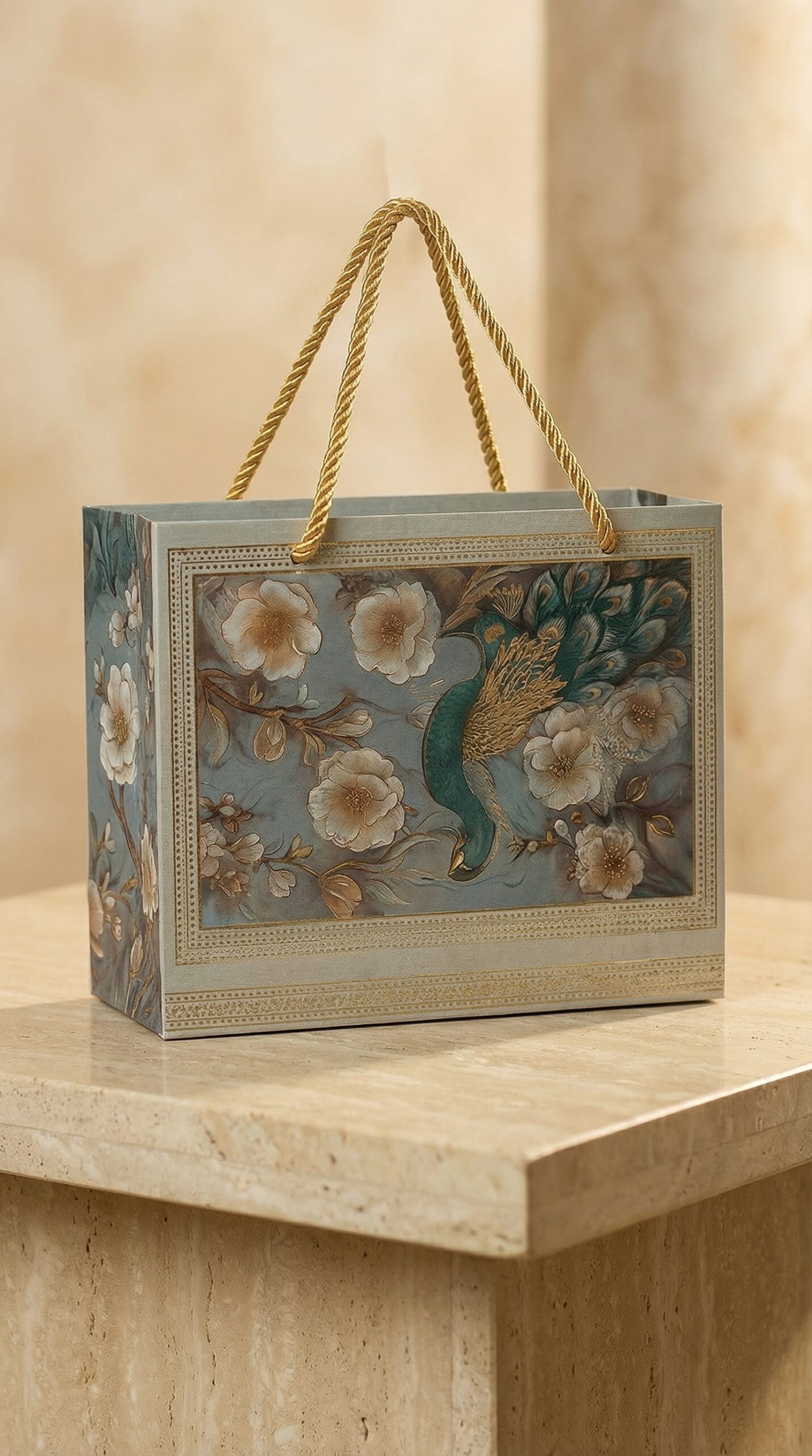Step into the world of regal celebrations with our Mayura Blooms Wedding Box — crafted to make your first impression unforgettable. Designed for couples who value sophistication and wholesalers seeking premium quality, this box reflects timeless Indian elegance with royal charm. The exquisite peacock-themed paper design symbolizes grace, beauty, and deep lovely connection — perfect for celebrating the union of two souls. Made from premium MDF wrapped in stunning decorative paper, the box features an elegant pearl handle that adds a touch of luxury and makes carrying effortless. The thoughtfully designed box includes 2 beautifully crafted jars for sweets or dry fruits, making it ideal for presenting your wedding favors with style. Whether you’re planning a grand traditional wedding or looking for bulk orders for your events business, this invitation box elevates your celebration’s tone right from the start. Perfect for couples, families, event planners, and wholesalers looking for something unique, this box makes every moment feel personal, thoughtful, and luxuriously memorable.