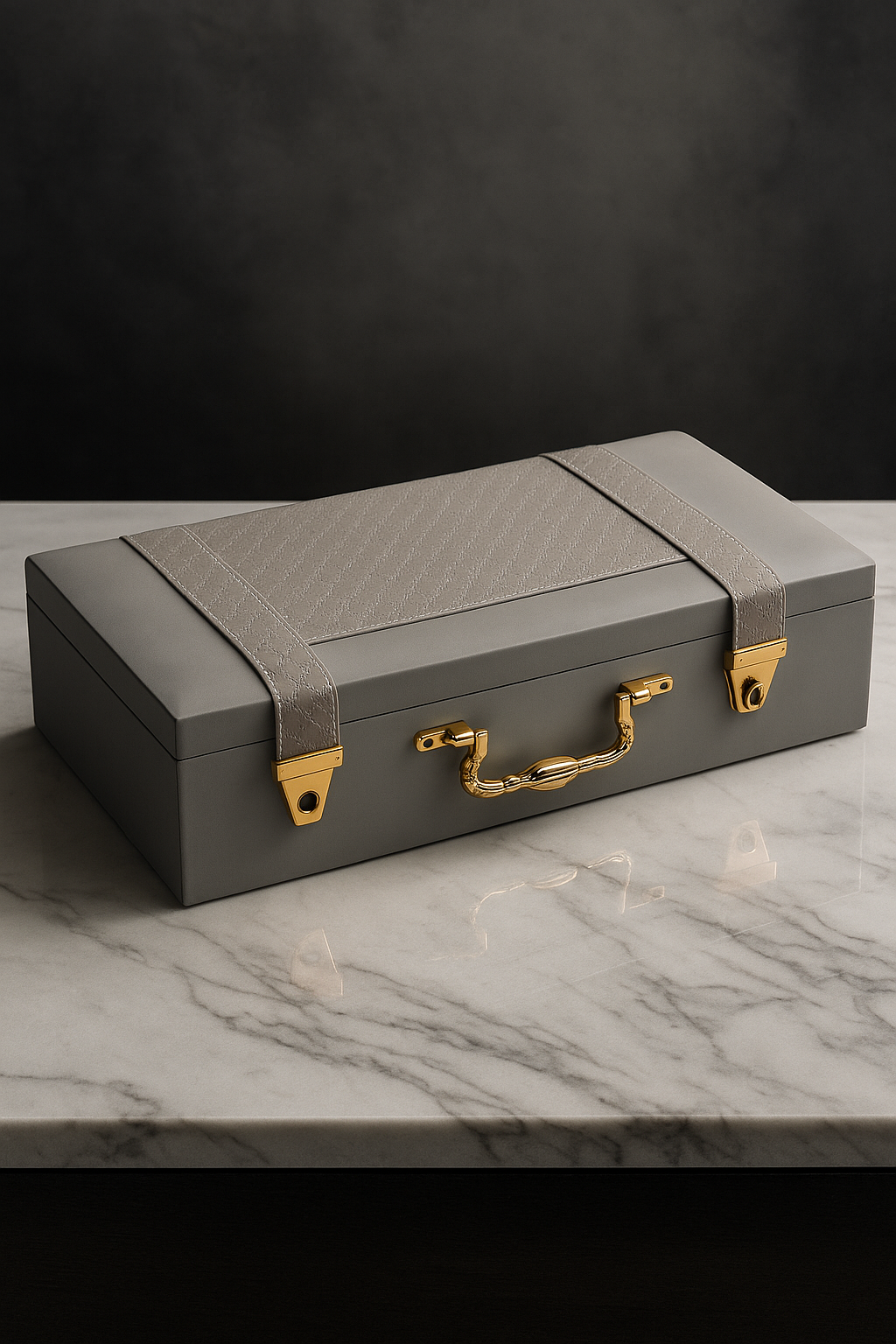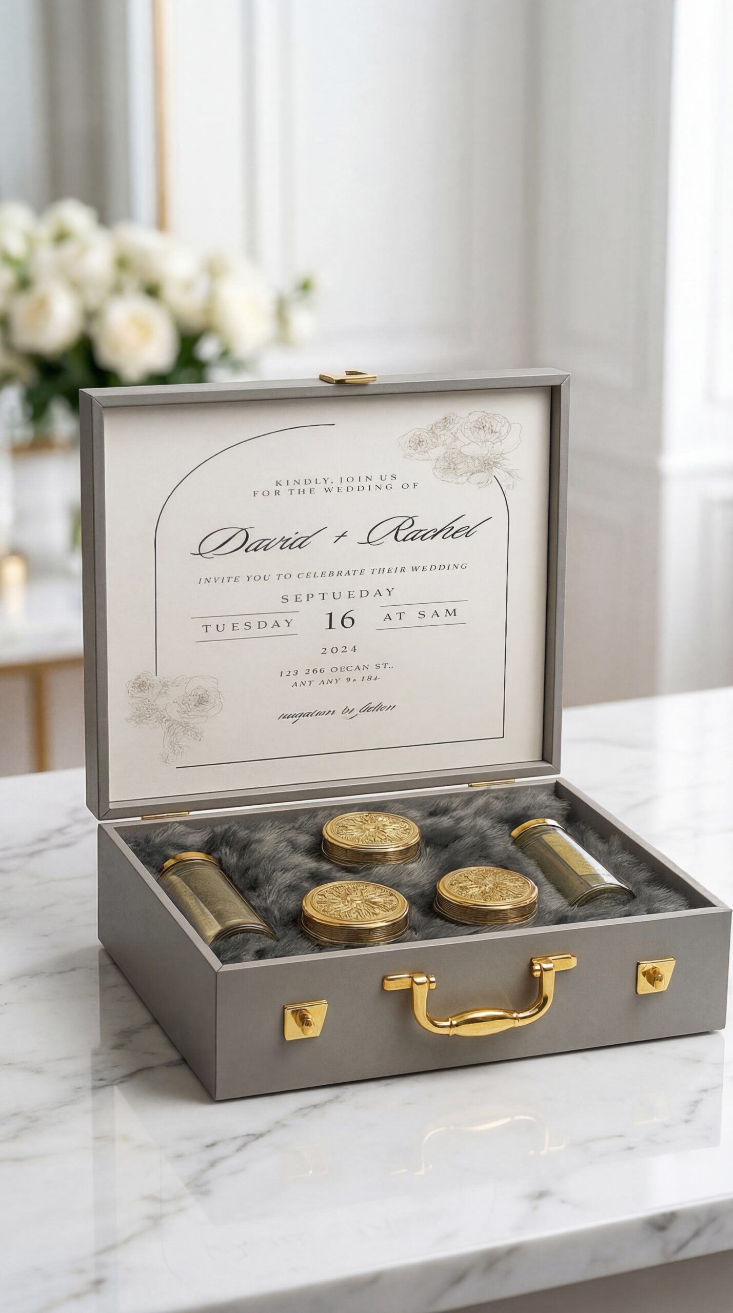 Elevate your celebrations with the Manglik Wedding Invitation Box — a perfect blend of modern elegance and timeless sophistication. This luxury grey invitation box features golden accents, including a premium golden handle and secure golden clasps for a royal touch. Crafted from high-quality MDF with rexene and paper covering, the box showcases a minimalist floral design on the lid with delicate line art that adds subtle charm. Inside, a plush grey fur lining cradles 5 elegant jars (2 tall + 3 round with golden lids) for sweets or dry fruits, while the invitation card is beautifully displayed inside the lid. Perfect for weddings, engagements, and special celebrations. Ideal for couples, families, event planners, and wholesalers seeking premium quality, elegant presentation, and contemporary design. This keepsake-worthy box combines functionality with luxury, making it a memorable gift that reflects refined taste and sophistication.