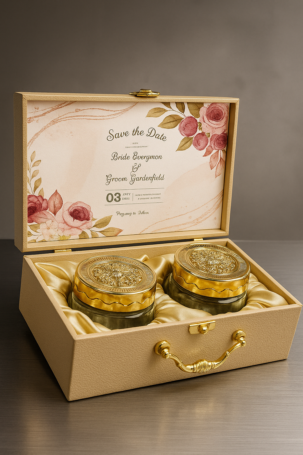 This 2-jar box is ideal for wedding giveaways, dry fruit gifting, or festive celebrations. Whether you’re preparing wedding hampers, giving a bride and groom’s gift, or sharing your gratitude with guests, this premium handcrafted box elevates every moment with its graceful charm.